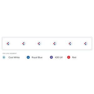 Each AI Blade LED Strip includes roughly one light cluster group per foot of fixture length. Tight grouping and balanced diode placement contribute to the incredible balance and shimmer that the Blade platform delivers. The Blade Refugium includes the following 24 diodes: