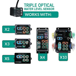 The HYDROS Triple Optical Water Level Sensor can be used for a variety of aquarium applications, such as sensing when your tank needs to be topped off or detecting when a dosing container needs a refill. It plugs into any Sense Port on a HYDROS device (like the Control XS, X2, X4, X10, etc.) and does not require any additional power source.