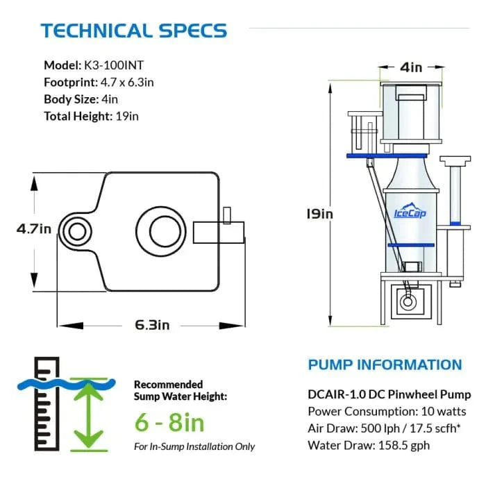 The IceCap K3-100INT is a compact in-sump protein skimmer ideal for aquariums up to 80 gallons. In addition, IceCap built this skimmer to surpass many challenges other skimmers on the market cannot. Simple-to-use pump controller with 10 power levels and a feed timer.