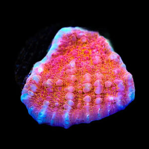 Chalice corals are a striking group of LPS (Large Polyp Stony) corals prized for their vivid colors and intricate patterns. Species such as Echinophyllia and Oxypora are known for their encrusting or plating growth forms, which add a unique texture to reef aquariums. Their vibrant shades of pink, orange, green, and purple, often highlighted with contrasting “eyes” and ridges, make them a favorite among collectors.