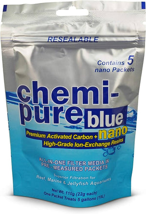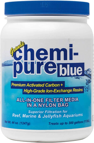 By combining premium pelletized carbon with specialized ion-exchange resins and placing these inside of a fine-mesh nylon media bag, Chemi-Pure Blue delivers a convenient and effective way to rapidly remove organic compounds and improve water clarity in your aquarium. The premium-grade carbon and scavenging resins are able to effectively reduce dissolved wastes, odors, phenols, toxins, medications, and even phosphates and silicates. Another benefit of the reduction of dissolved organics in the water column is a natural increase in REDOX, allowing for more efficient breakdown of solid wastes in the aquarium. This will have a positive effect on coral and fish health, assist in maintaining system stability, and improve the overall appearance of your aquarium.