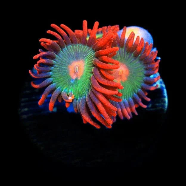 Feeding Zoanthids with nutrient-rich foods like Reef Roids, amino acids, and plankton blends supports their pigmentation and overall health. Stable water parameters and trace elements, such as iodine and iron, further enhance their vibrant appearance.