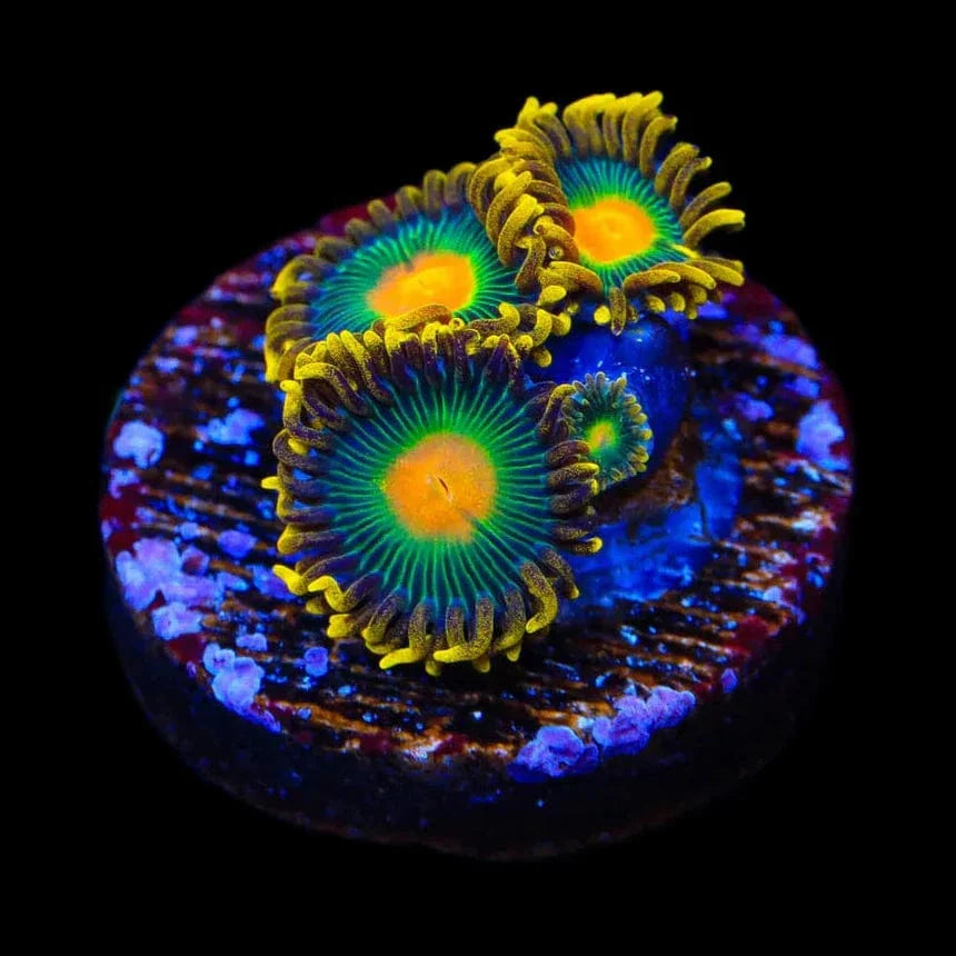 Feeding Zoanthids with nutrient-rich foods like Reef Roids, amino acids, and plankton blends supports their pigmentation and overall health. Stable water parameters and trace elements, such as iodine and iron, further enhance their vibrant appearance.