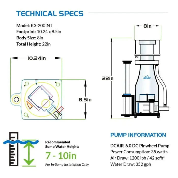 The IceCap K3-160 INT is an In-sump protein skimmer that provides exceptional filtration performance with the smallest footprint for marine aquariums up to 250 gallons. In addition, IceCap built this skimmer to surpass many challenges other skimmers on the market cannot. Simple-to-use pump controller with 10 power levels and a feed timer.