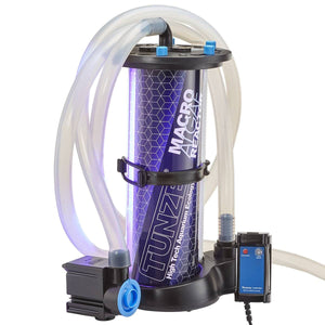 Cultivating chaetomorpha algae in the Tunze MAR-3181 makes controlling your aquariums nutrients clean and easy. Tunze's algae reactor can be placed internally in your sump, or placed externally if you do not have room in your sump, or just don't have a sump. The reactor uses an external lighting solution provided by the Tunze Eco Chic Refugium Light that can be fully submerged underwater for maximum efficiency. To help increase the efficiency of the external light, water that is input into the reactor creates a spinning effect that forces the algae to circulate inside the MAR-3181. One of the biggest downsides to an algae reactor is the maintenance, and Tunze has made harvesting super simple with an easy to remove lid that is held on by large thumbscrews and only takes about a minute to remove the algae, harvest it, and replace the cap.