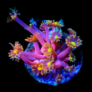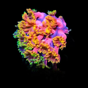 Typically showcasing hues of green, yellow, pink, or purple, Goniopora corals create a mesmerizing display as their polyps extend and sway with the flow of water. Known for their moderate care requirements and adaptability, they are an excellent choice for intermediate reef keepers looking to add a dynamic focal point to their aquascape.