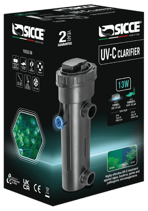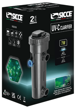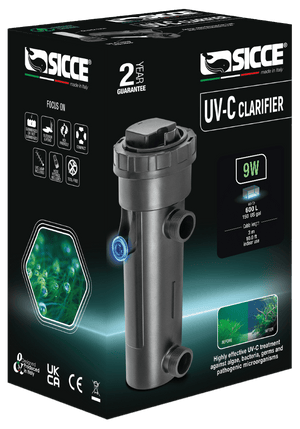 The UV-C Clarifier, boasting an IP68 rating, is fully submersible and designed for direct immersion in ponds or aquarium sumps. Featuring a safety switch that automatically deactivates the UV-C lamp during maintenance, it ensures safe handling. Its compact size makes it ideal for aquariums, turtle tanks, and ponds.
